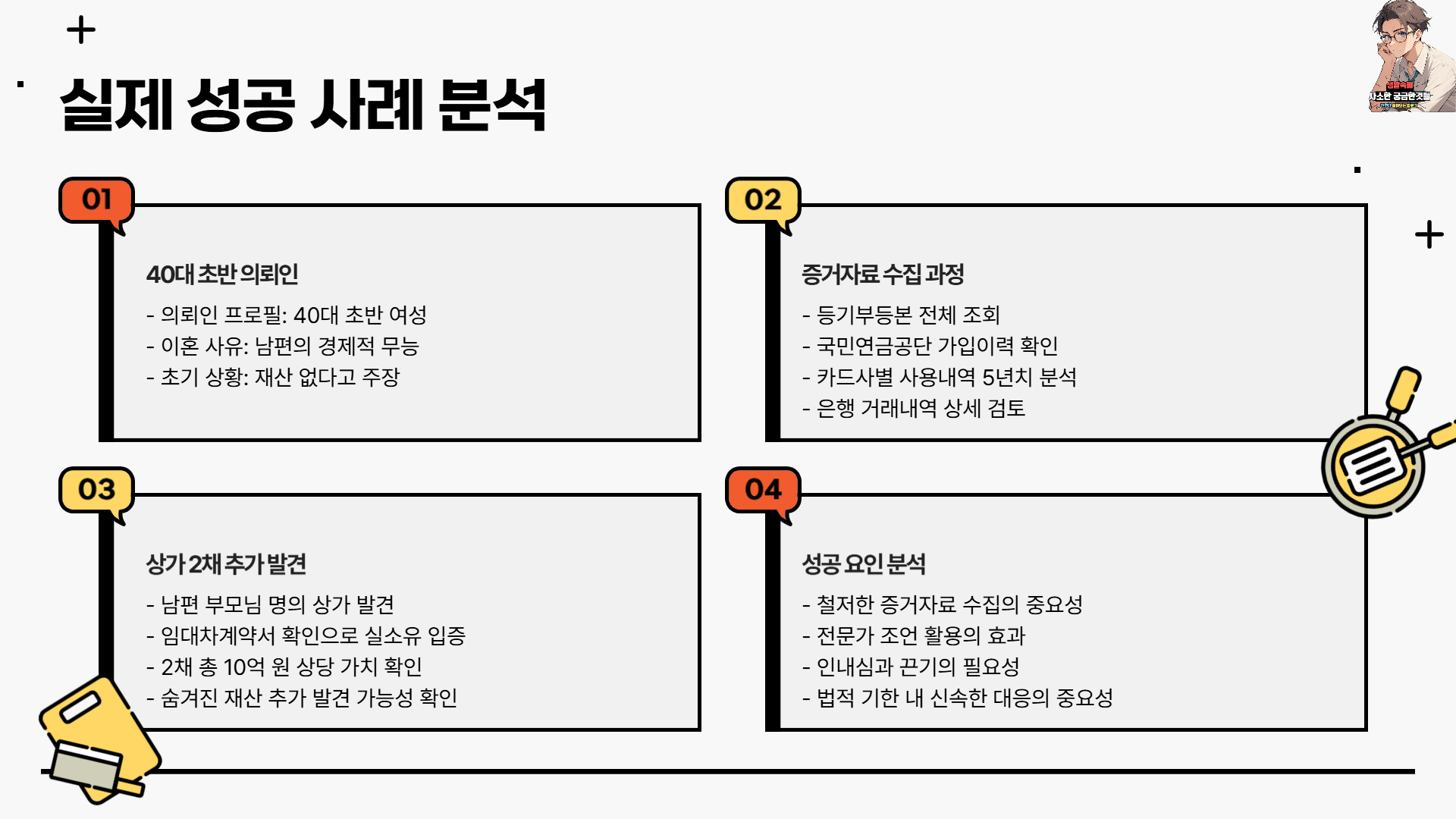 가장 최근에 성공한 사례를 공유할게요. 40대 초반의 의뢰인이셨는데, 제가 알려드린 대로 증거자료를 차근차근 모으셨어요. 그 결과 전 배우자의 상가 2채를 추가로 발견했죠. 여러분도 이렇게 하세요: