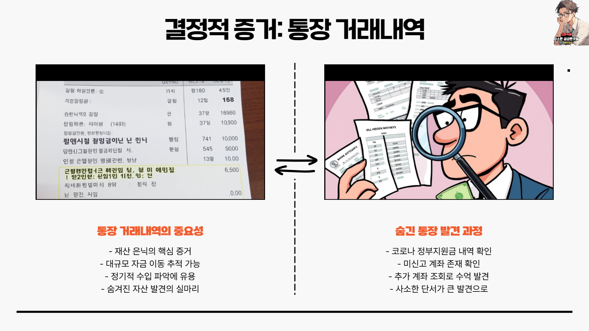 제가 지난주에 성공한 이혼 후 재산청구 사례에서는 이런 게 결정적이었어요. 바로 통장 거래내역이에요. 특히 코로나 시기에 받은 정부지원금 내역을 통해 숨겨둔 통장을 발견했죠. 사소해 보이는 단서가 수억대 재산을 찾는 실마리가 된 거예요.