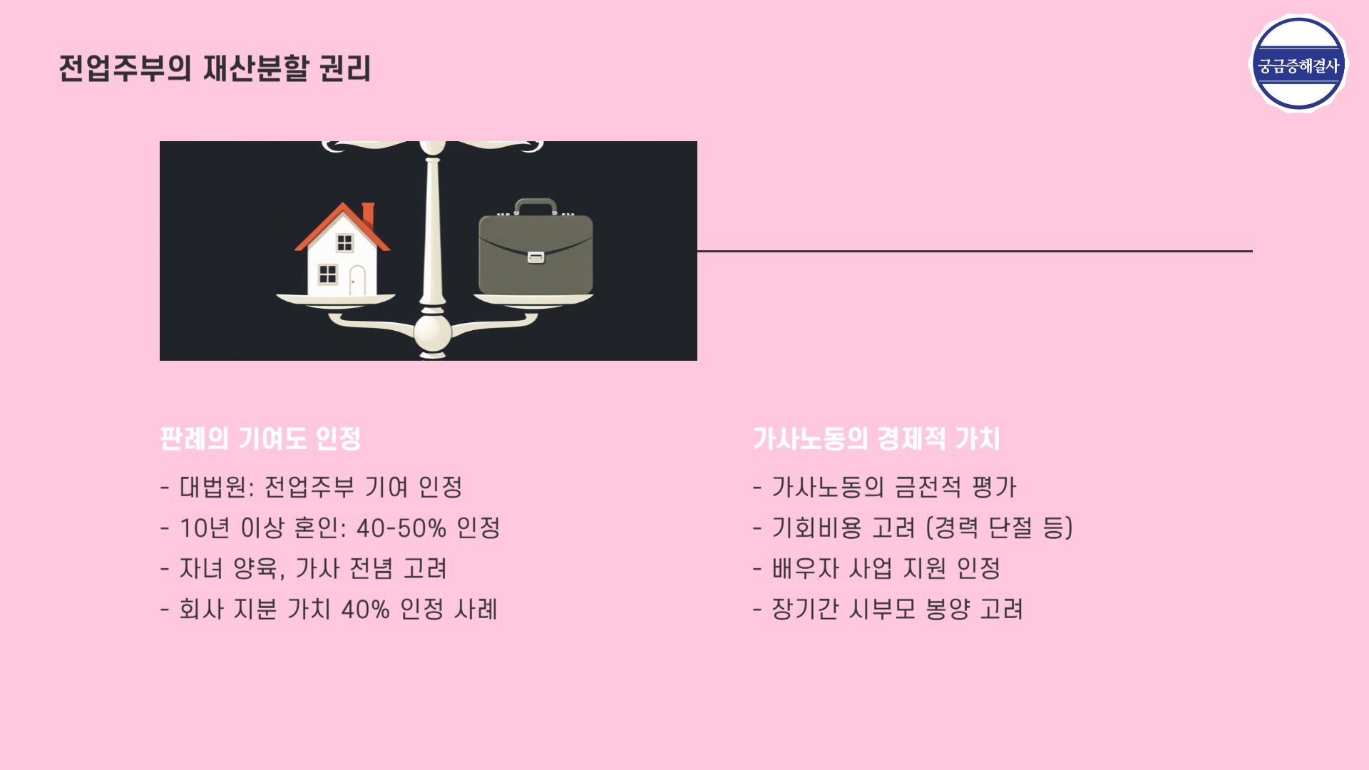 최근 이혼 재산분할 판례를 보면 전업주부의 기여도를 상당히 높게 인정하고 있어요. 제가 맡았던 비슷한 사례에서는 남편 회사 가치의 40%까지 인정받으신 적도 있답니다.