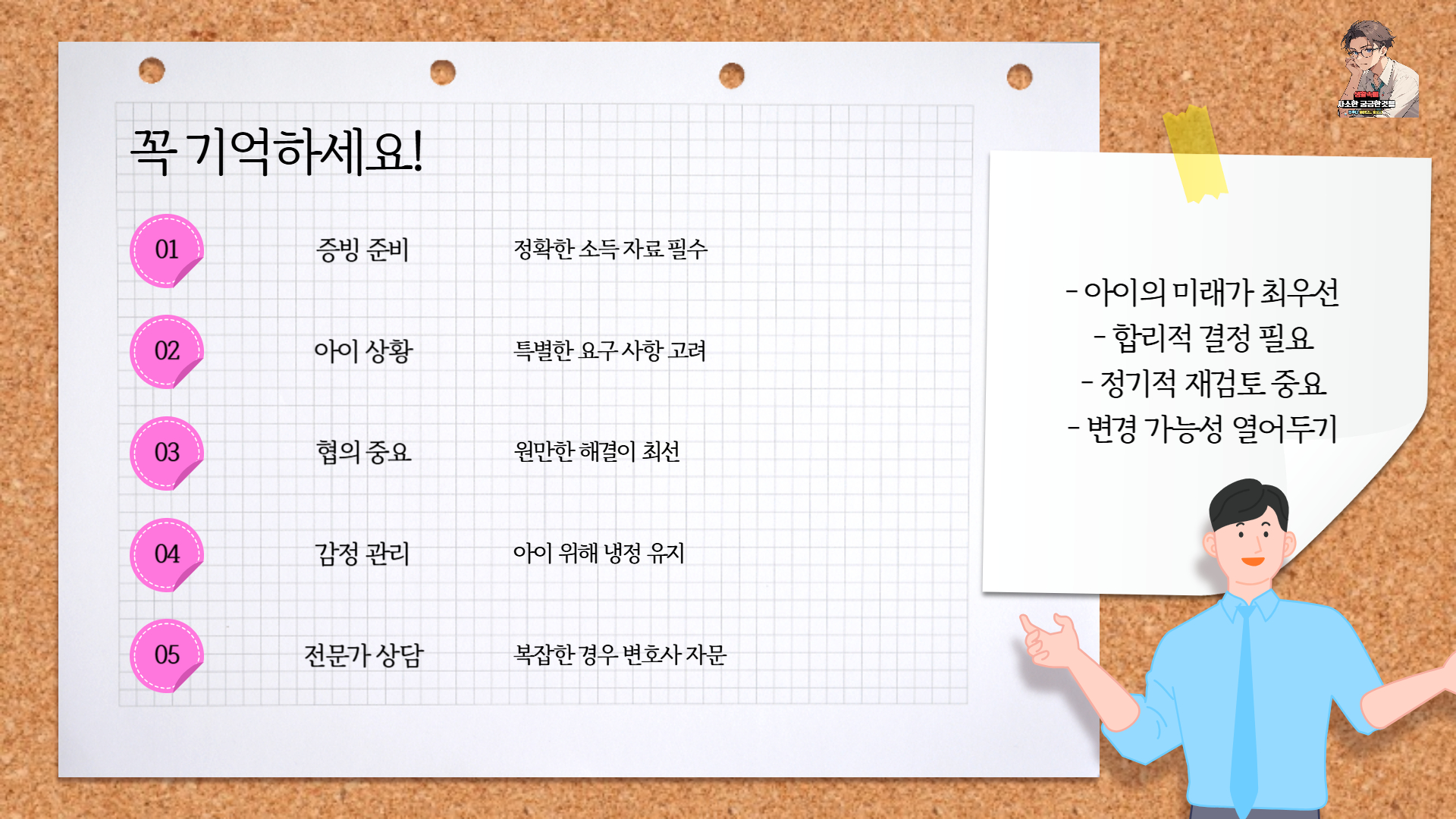 양육비 산정표는 단순한 숫자가 아닌, 우리 아이들의 좋은 미래를 위한 최소한의 기준입니다. 이것은 결코 누군가를 괴롭히거나 벌주기 위한 것이 아니라, 아이들의 건강한 성장을 위한 필수적인 요소라는 점을 꼭 기억해주세요.
